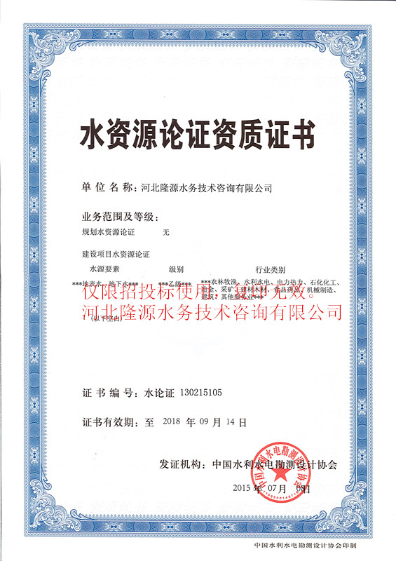 2015年7月8日我公司申请的水资源论证资质扩项得到批准,为我公司颁发了新的水资源论证资质证书。我公司的受理业务得到了扩大。