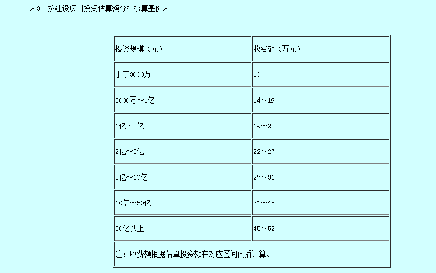 2.以建设项目投资规模为主要因素的报告书编制费用核算方法(简称方法2):以投资核算基价为基础,乘以行业调整系数、论证等级调整系数和水源调整系数确定。核算基价和调整系数分别见表3和表4。其中,投资规模是指项目建议书或可行性研究报告的估算投资额。