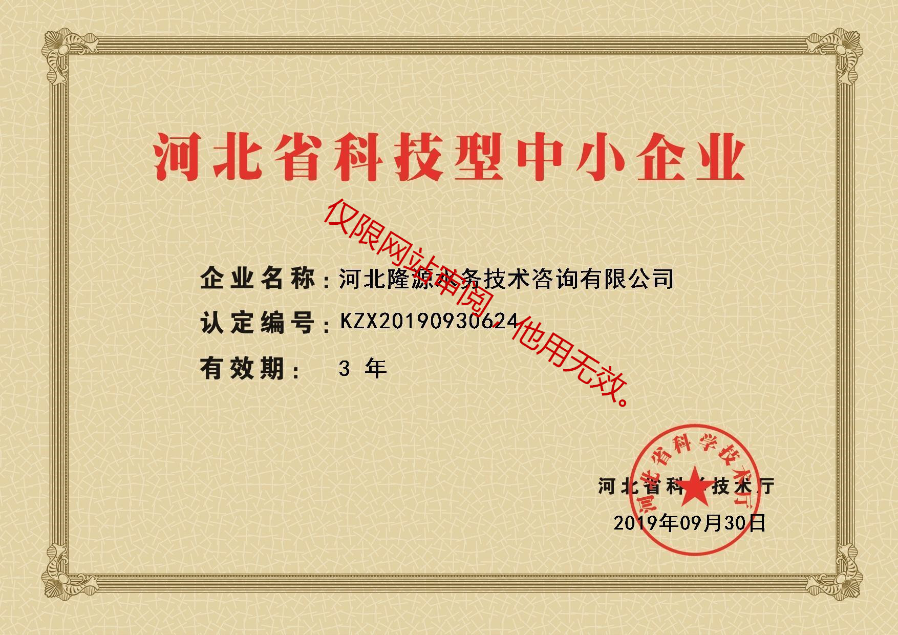 根据河北省科技厅的认证,2019年9月30日我公司被认定为河北省科技型中小企业,有效期3年。